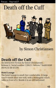 I was recently priviliged to help Simon Christiansen make his interactive fiction Death off the Cuff into an app for Android devices. It’s currently available from Google Play and the Amazon App Store, with the Samsung store and Barnes and Noble Nook hopefully soon to follow.